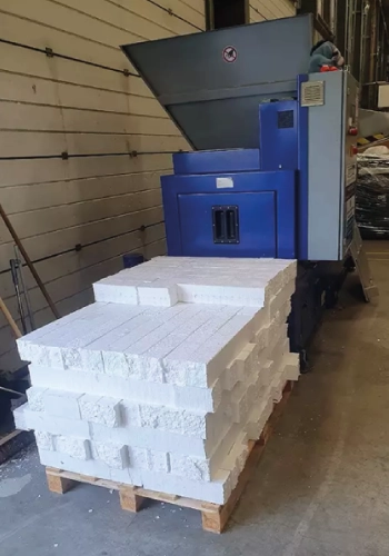 Briquetting machines can convert bulky EPS waste into dense briquettes weighing up to 700kg/m³. A single pallet can hold around a tonne of compacted polystyrene, making transportation far more cost-effective.