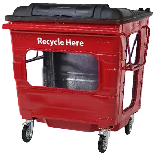 Steel bins with viewing windows, protected by heavy steel fabrication. These windows are available on the front, side, or a combination of these, which both prevents rubbish being left outside the bin believing it is full and makes spotting contamination of materials easier.